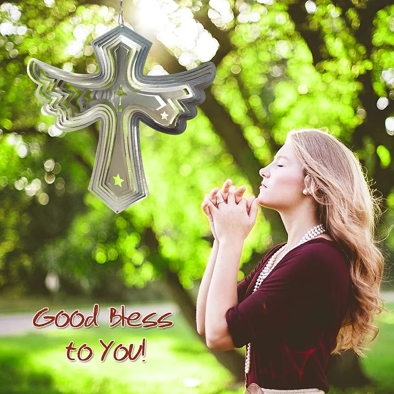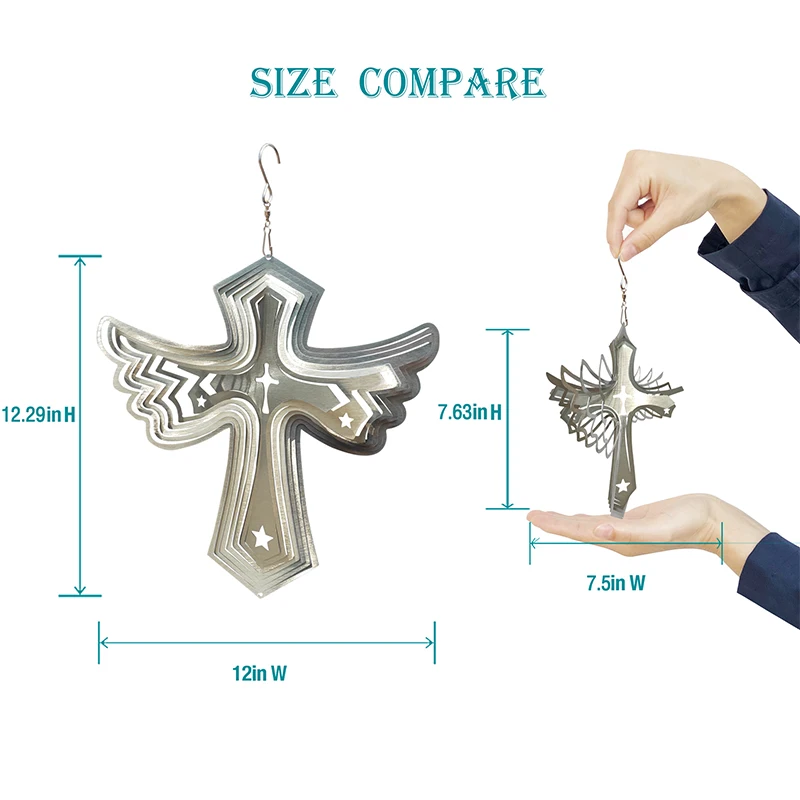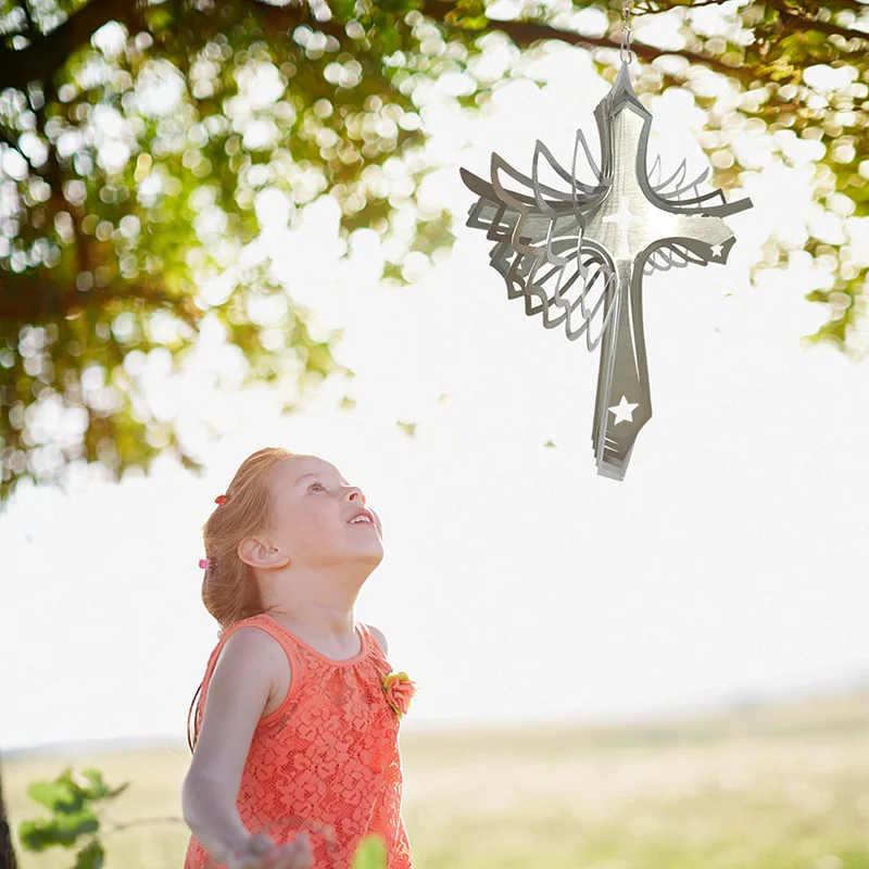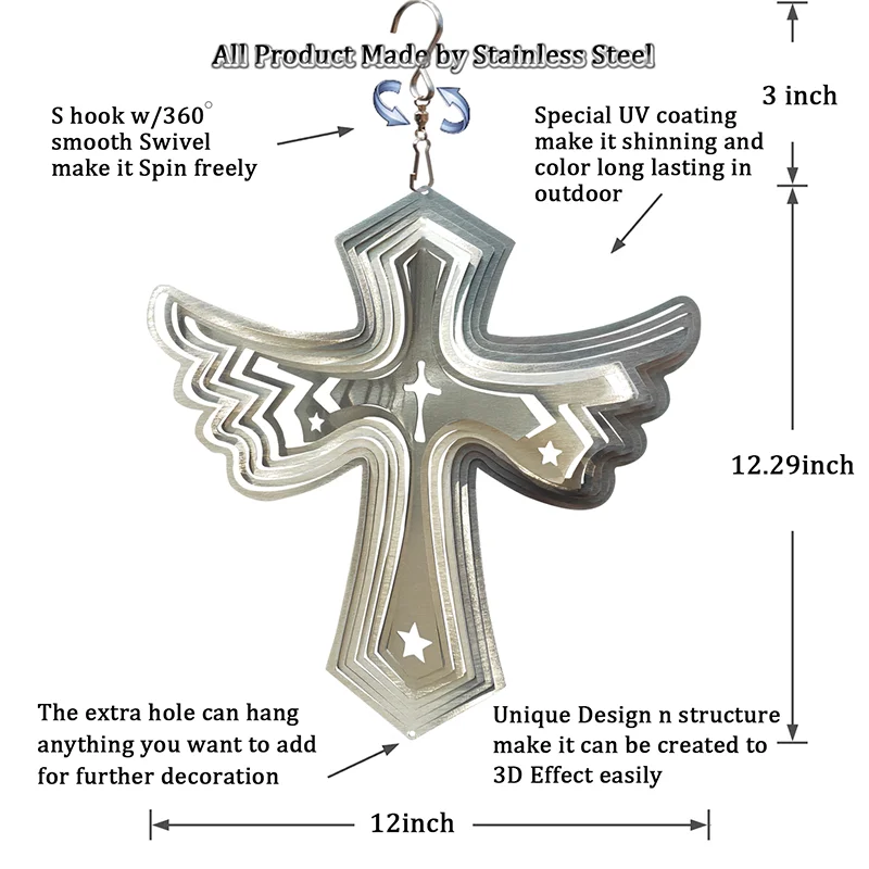 Cross Angel Memorial Wind Spinner. This beautifully crafted stainless steel spinner is designed to serve as a lasting tribute, creating a serene and reflective atmosphere for your home or garden.