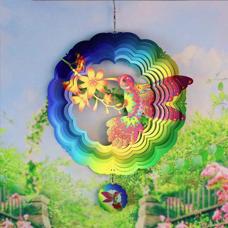 ✨ Transform Your Garden with the vibrant beauty of a red hummingbird feeding from a golden flower, surrounded by soft gradients of blue, green, and yellow. This 3D kinetic wind spinner is the perfect blend of color and movement, bringing life to your yard or patio.