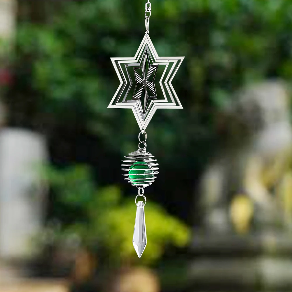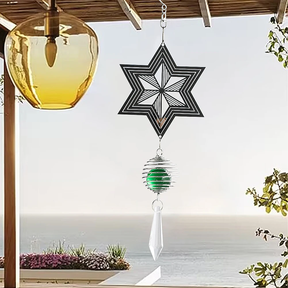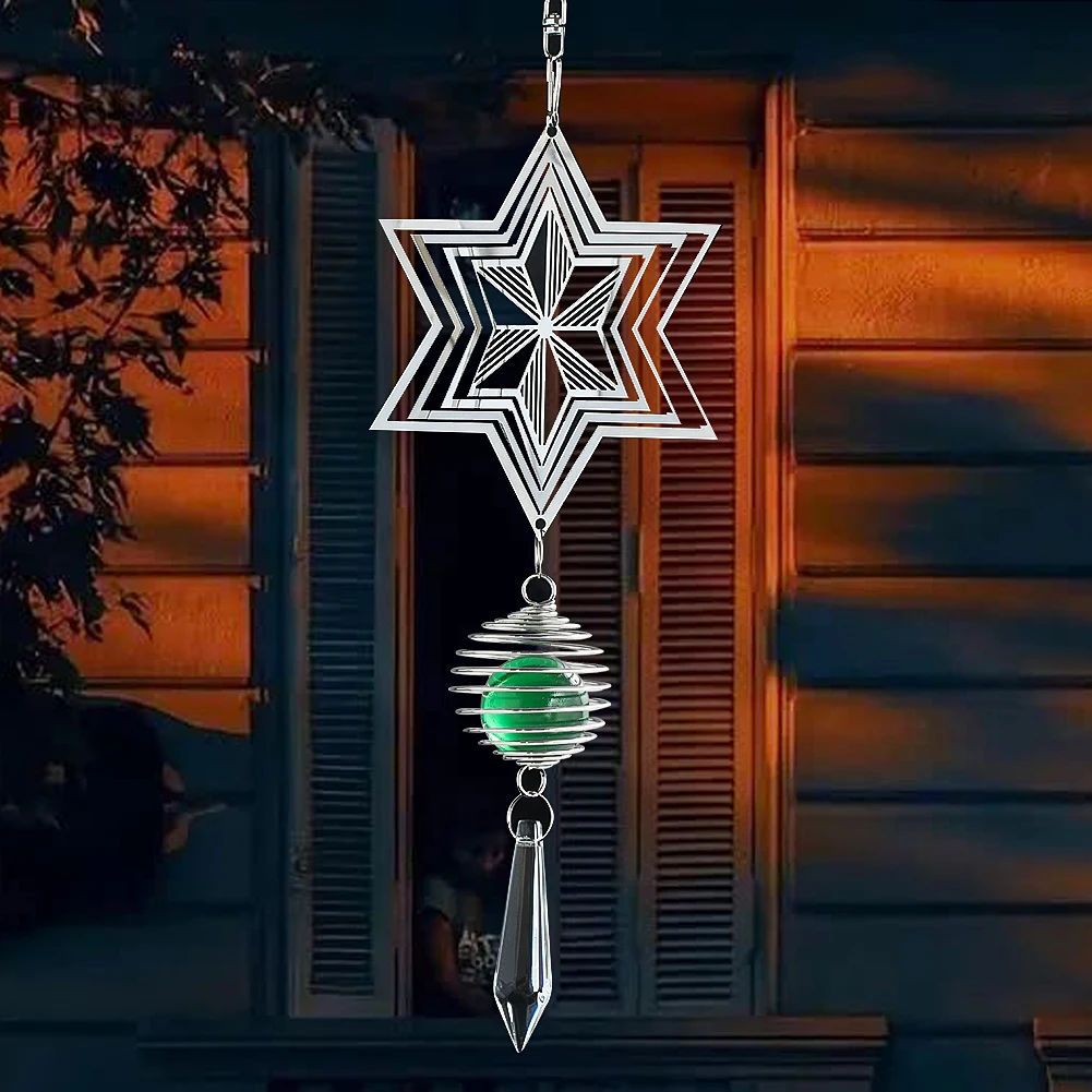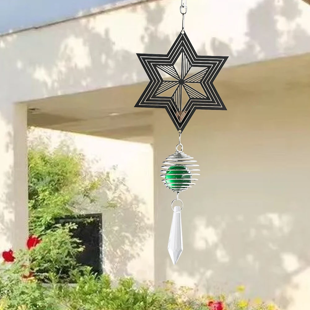 Enhance your home or garden with this elegant Six Pointed Star 3D Rotating Wind Spinner. Crafted from stainless steel and featuring a clear crystal pendant, this wind spinner combines artistic design with reflective beauty. Its mesmerizing 3D rotation creates a captivating display in the breeze, making it a stunning addition to any space.
